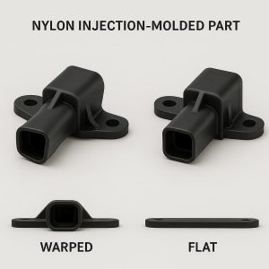 С точки зрения материала, коробление связано с кристаллизацией полиамида. Нейлон — полукристаллический полимер, быстро кристаллизуется при охлаждении и имеет значительную объемную усадку. Неравномерная степень кристалличности вызывает локальные напряжения и изгиб. Добавление нуклеирующих агентов и регулирование молекулярной массы способствуют равномерной кристаллизации и уменьшению напряжений. В армированных системах направление стекловолокон усиливает анизотропию усадки, поэтому необходимо контролировать как состав, так и процесс переработки.